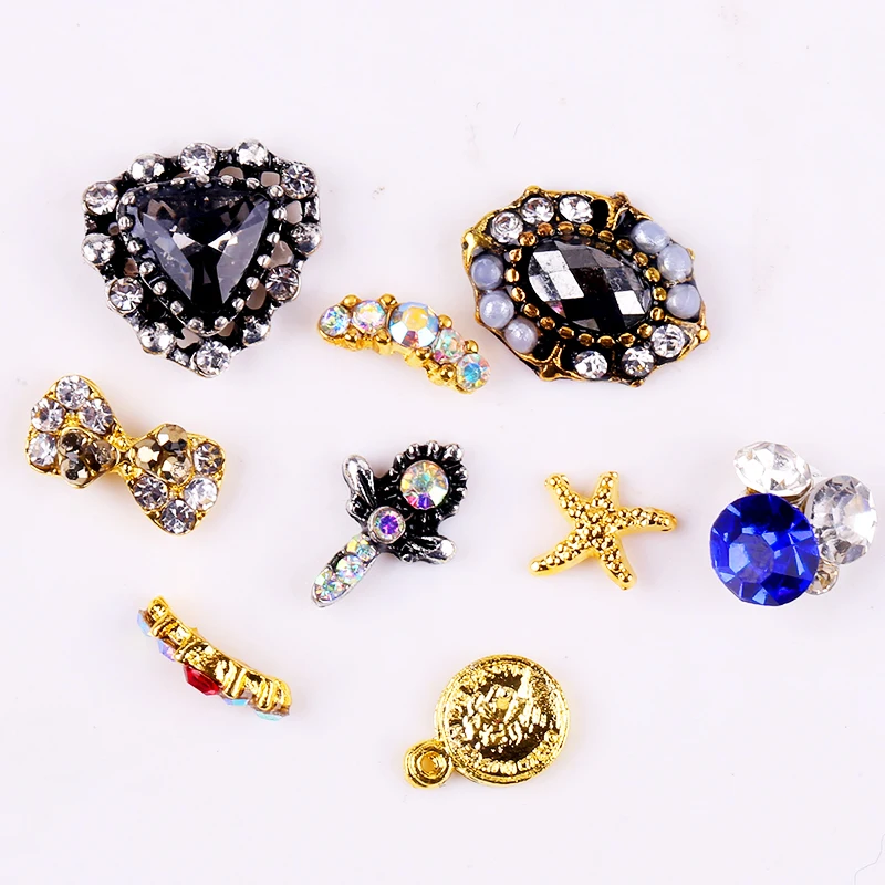 price reduction 9Pcs/Box Clock Pearl Bow Triangle Retro Design 3D Metal Alloy Studs Nail Stickers Nail Art Decorati