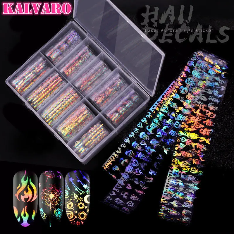 Very best Kalvaro 10roll/lot Flame Pointed False Nails Tips Nail Stickers Thin Laser Silver Stripe DIY Decals